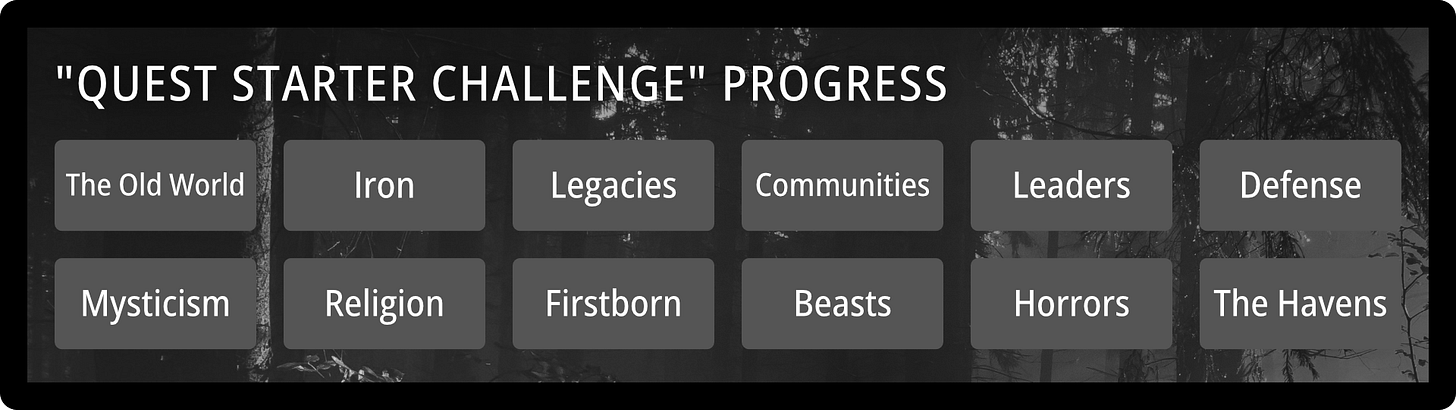 Throughout the Ironsworn rulebook, there are prompts called “Quest Starters” whose purpose is to help the player come up with creative story ideas for their campaign. For this challenge, we’re going to try to utilize in our campaign every Quest Starter associated with our truths and starting region—that’s 12 prompts in total.
